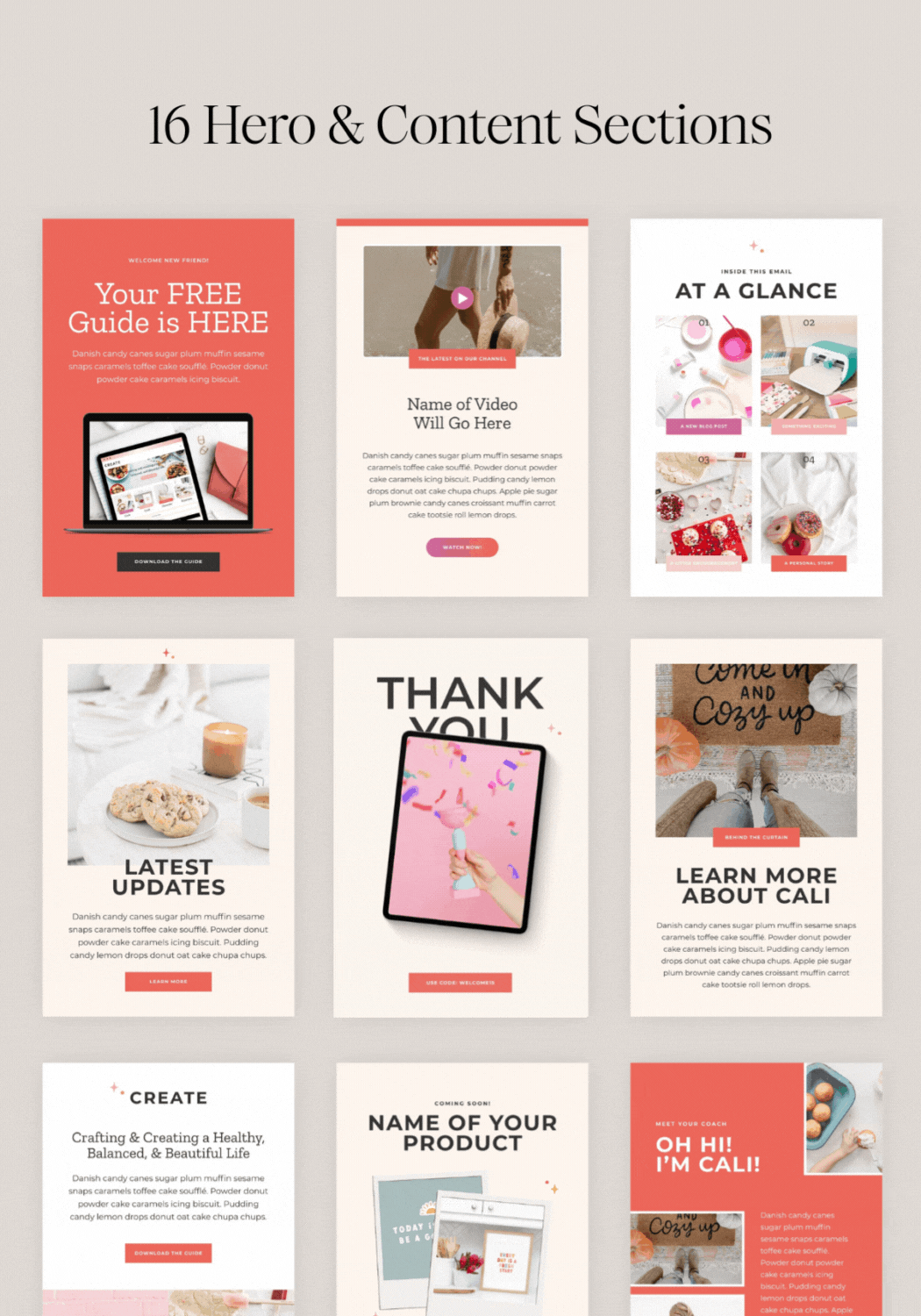 - 16 Hero & Content Sections – Mix and match bold hero images, text blocks, and layout options to build gorgeous email designs.